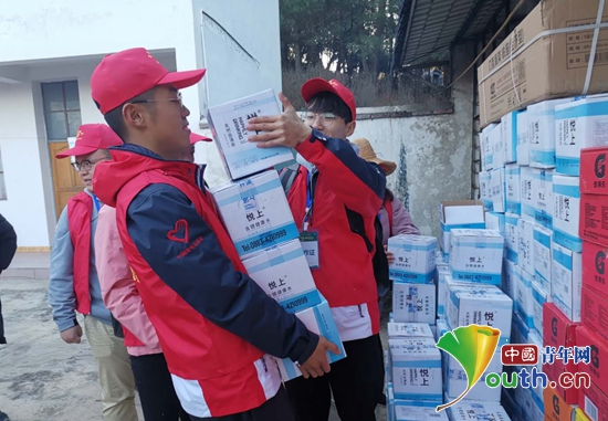 2019昌宁茶香文化旅游节千年茶乡·秘境天堂徒步越野大会精彩开幕。图为东北大学研支团志愿者在赛前装抬比赛物资。东北大学研支团 供图