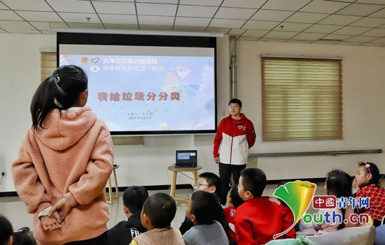 研支团成员毛文轩带领小朋友们学习垃圾分类。华中科大研支团供图