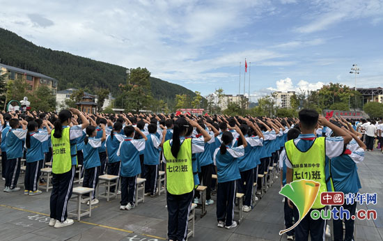 锦屏县第四中学师生们在庆祝教师节活动中进行升旗仪式。贵州大学研支团供图