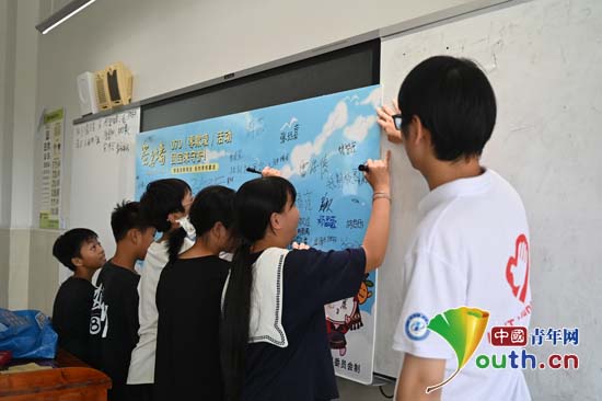 “不做霸凌者、不做旁观者”,湖北工业大学研究生支教团成员组织学生们在签名墙上完成自己的“青春承诺”。