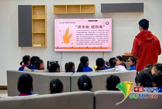 南京农业大学公共管理学院土地资源管理专业的志愿者,通过PPT为孩子们介绍了设立中国农民丰收节的相关知识。南京农业大学研支团供图