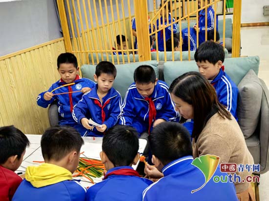 研支团成员带领孩子们用扭扭棒编制手工作品。南京农业大学研支团供图