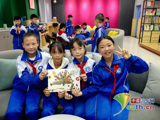 麻江县第三小学的孩子们展示自己制作的树叶画。南京农业大学研支团供图