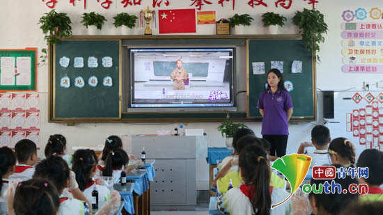 天津工业大学纺织科学与工程学院的师生在线为贵州省石阡县第二小学的孩子们讲解扎染知识。天津工业大学研支团供图