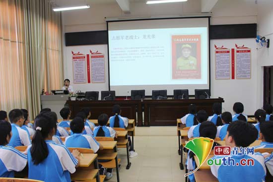 在主题团课上,研支团成员为贵州省锦屏县第四中学的学生们讲述抗美援朝老战士龙光荣的事迹。贵州大学研支团供图