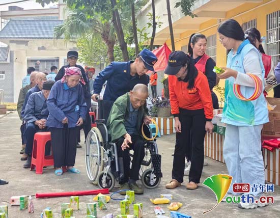 广西壮族自治区宁明县西部计划志愿者在明江镇敬老院组织老人开展欢乐套圈游戏。宁明县项目办供图