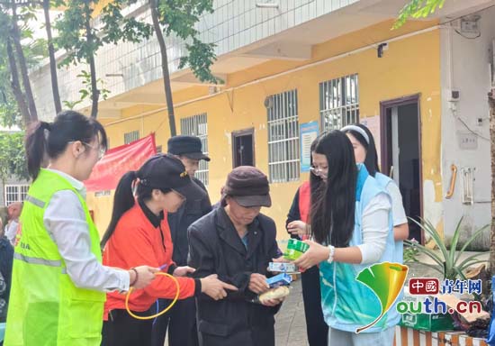 西部计划志愿者为参与游戏的老人送上奖品。宁明县项目办供图