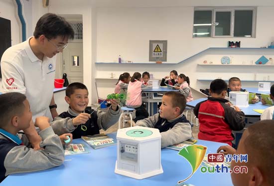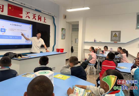 东北大学研究生支教团在新疆维吾尔自治区布尔津县冲乎尔镇寄宿制中学开展“我们爱科学”主题科普活动。图为研支团成员为学生讲解AI的相关知识。东北大学研支团供图