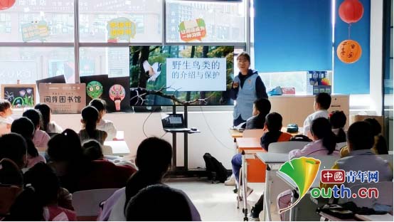 志愿者魏钦芳为孩子们科普野生鸟类保护知识。团射洪市委供图