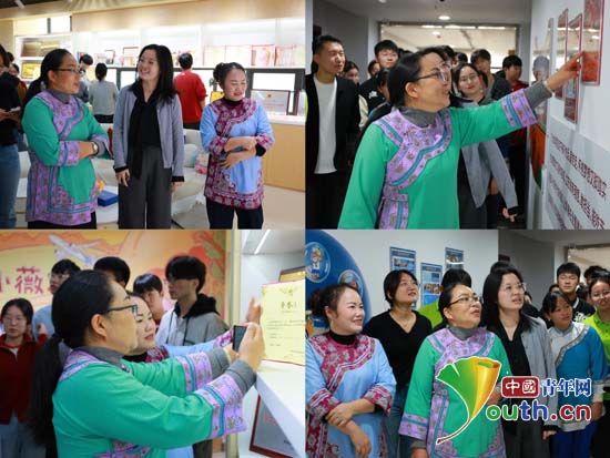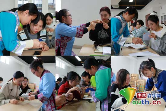 三都特校副校长杨春凤指导武汉理工大学的大学生制作马尾绣。中国青年网通讯员胡纯菲供图