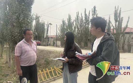 志愿者张文卓(右一)与同事在走访中与村干部进行交流。张文卓供图