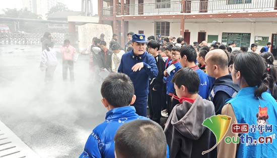 在消防员指导下志愿者进行灭火器的使用操作。翠屏区项目办供图