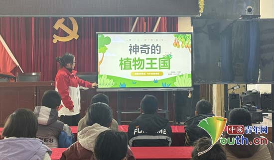 课堂上,王琪通过PPT演示、实物展示与趣味动画相结合的方式,生动讲解了会动的植物、食肉植物、伪装植物及植物之最等趣味知识。捕蝇草的捕食瞬间、含羞草的“害羞”反应、生石花的伪装绝技等内容,配合直观的视频片段,让抽象的植物生存原理变得通俗易懂,瞬间点燃了孩子们的探索热情。