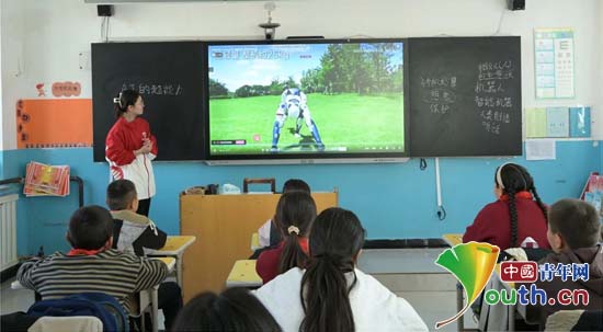 吉林大学研究生支教团在新疆维吾尔自治区哈巴河县库勒拜镇喀拉希力克村小学开展“我们爱科学”青少年科普教育活动。图为研支团成员为学生播放AI仿生机器人视频。吉林大学研支团供图