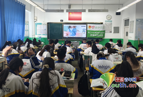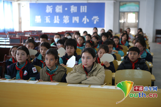 图为墨玉县第四小学学生认真观看漆扇制作视频。马骏供图