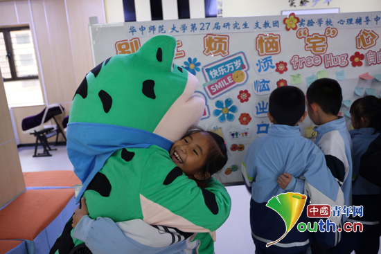 活动伊始,研支团成员身穿小青蛙玩偶服,提前在教学楼门口等待学生。课后铃声刚落,不少学生便被可爱的玩偶所吸引。他们有的轻轻环抱玩偶,有的把头靠在玩偶肩上,学习带来的紧张感在与玩偶的互动中慢慢消散。“平时作业多的时候心里总觉得慌,抱着玩偶心情一下子就平静了下来。”“华师班”学员张俊睿笑着说。