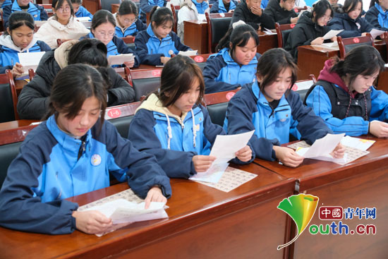 宁夏回族自治区固原市原州区杨郎九年制学校的孩子们阅读福建师范大学大学生写给他们的回信。福建师范大学研支团供图