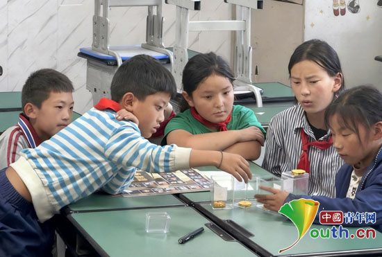 西南财经大学第27届研支团成员吴烜在四川省金川县勒乌镇第二小学开展青少年财经素养教育活动。图为研支团成员带领学生通过桌面游戏学习财经知识。西南财经大学研支团供图