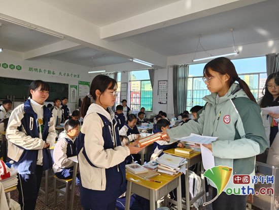 贵州大学第27届研究生支教团贞丰支队联合四川省贞丰县Join Fun图书馆,在贞丰县第二中学举办“书香进校园”主题活动。图为研支团成员为学生发放书籍。贵州大学研支团贞丰支队供图