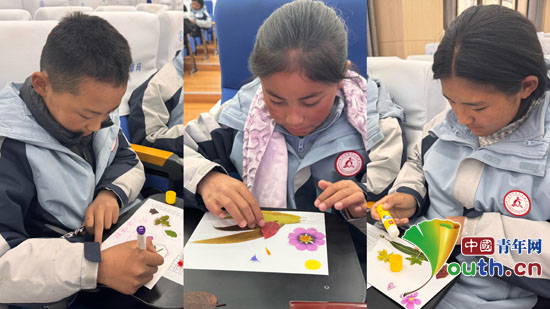 华南师范大学研究生支教团西藏昌都分队与广东汕尾分队联合发起“粤藏共赏·秋韵同绘”秋日主题作品通信交流活动。图为昌都市第三初级中学的学生在制作贴画。华南师范大学研支团供图