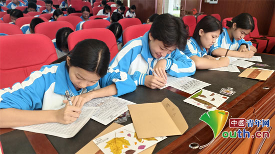 广东省汕尾市红海湾经济开发区白沙中学的学生为西藏自治区昌都市第三初级中学的伙伴写书信。华南师范大学研支团供图