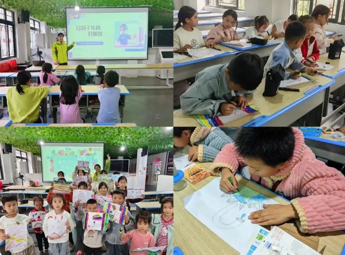 “我画的是听到歌声时的感觉!”在《看不见的声音,画得出的感情》美育课上,老师引导孩子们闭上眼睛,聆听旋律,再将听到的声音转化为色彩与形状;在《穿越千年的好朋友》课堂上,孩子们通过演绎孔融让梨、品味孟母三迁,提笔将心中的仁爱与勇气绘成一幅幅独特的“经典故事绘本”,在传统与创新的交融中感受文化魅力,激发想象力与审美能力。