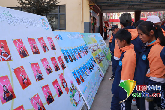 在西藏自治区昌都市类乌齐县中学,学生们在展板前欣赏照片。西南大学研支团供图