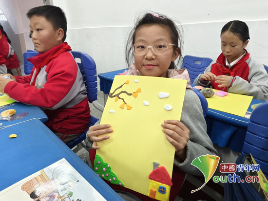 孩子展示自己的粘贴画作品。天工大研支团供图