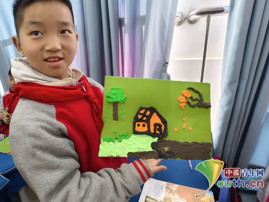 随后,志愿者带领孩子们用五彩粘土捏出金黄的银杏、火红的枫叶,将眼中的秋天定格在一幅幅生动的画作中。