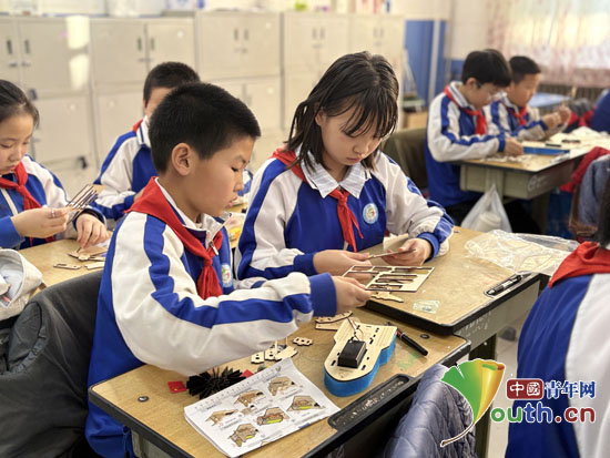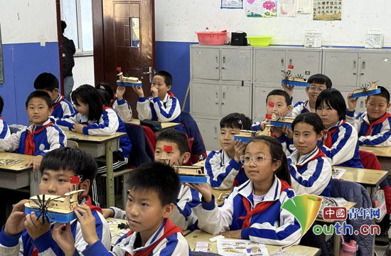 动手实践环节成为活动的“重头戏”。研支团成员拆分船模套件,逐一演示甲板固定、电机安装、传动轴对接等关键拼装步骤,并着重强调了电路连接的安全要点。拿到零件盒后,孩子们立刻开始进行船模拼装。有的专注研究说明书,有的交流组装技巧,有的在拼装中遇到卡壳处主动向老师请教。“老师,传动轴总是歪怎么办?”“电机怎么固定才能不会松动?”面对孩子们的问题,研支团成员穿梭于课桌间,俯身手把手示范,耐心解答孩子的疑问。当第一艘明轮船模型成功转动螺旋桨时,教室里爆发出热烈的欢呼声。孩子们举着自己的作品互相展示,成就感溢于言表。