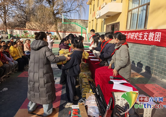 大连理工大学研支团青海服务队成员为青海省化隆回族自治县甘都镇东三完小的孩子们发放物资。大连理工大学研支团青海服务队供图