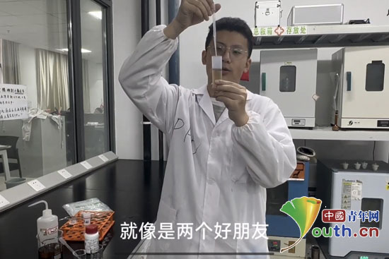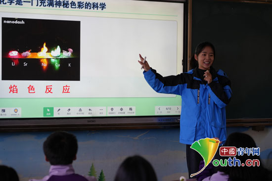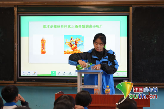 第26届研支团成员冯海涛通过远程连线,为学生演示“茶多酚变色”趣味实验。南工大研支团供图