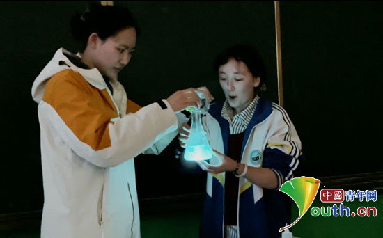在“鲁米诺发光”专题课上,研支团成员刘懿将鲁米诺试剂与过氧化氢溶液缓缓混合,锥形瓶中瞬间漾开幽蓝荧光,课堂上响起了学生们的惊叹声。“课本里‘电子跃迁’‘能量转化’的概念很抽象,但是当学生亲眼看到光的产生,就能直观理解分子能量变化的过程。”刘懿边举着发光的锥形瓶绕场展示,边细致讲解化学反应原理。