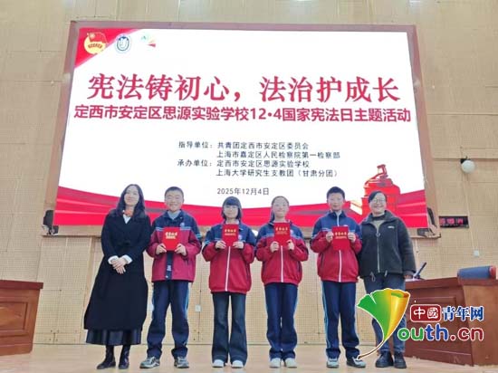 2025年12月4日,共青团甘肃省定西市安定区委员会副书记董辉、定西市安定区思源实验学校党总支书记刘彩霞为“宪法知识竞赛”获奖同学颁奖。上海大学研支团供图