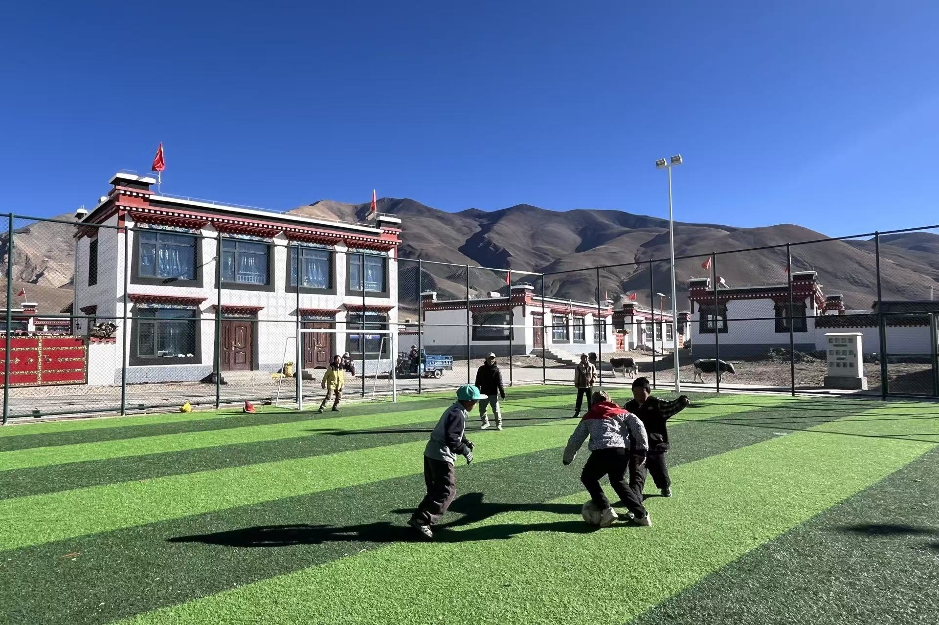 12月26日,灾后重建的长所乡森嘎村,孩子们在人造草坪的足球场上拼抢。