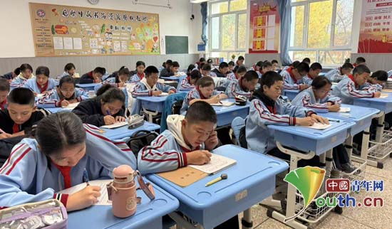 新疆生产建设兵团第十二师三坪农场子女学校七年级(3)班的学生在给青岛科技大学的大学生们写信。青岛科技大学研究生支教团供图