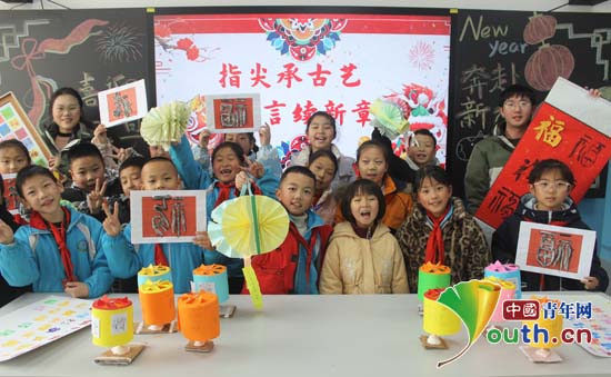研支团成员带领孩子们制作灯笼、拓印百福图并合影。温州医科大学研支团供图