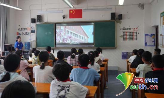 在贵州省息烽县底寨中学,安徽理工大学研支团成员梁安琪为学生播放大学校庆宣传片。梁安琪供图