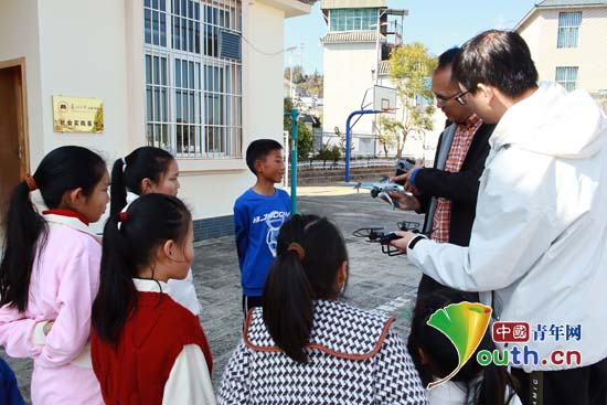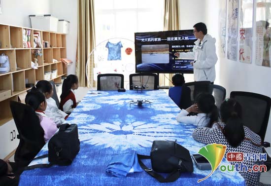 东北大学研支团志愿者为孩子们对比讲解第一代无人机与大疆无人机的区别。东北大学研支团供图