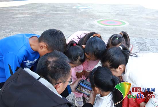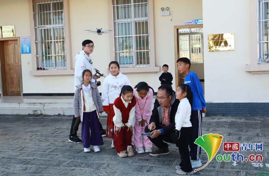 孩子们通过操控无人机飞行的屏幕俯瞰家乡全貌。东北大学研支团供图