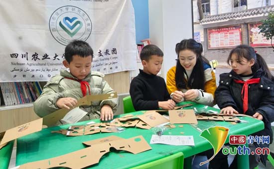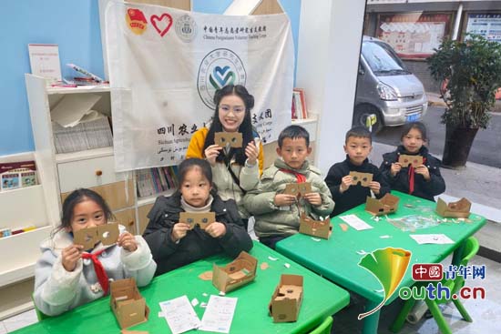 研支团成员鄢淑静协助社区小朋友制作VR眼镜。四川农业大学研究生支教团供图