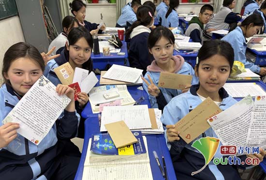 新疆维吾尔自治区库尔勒市第四中学的学生们收到北京师范大学大哥哥大姐姐写给他们的回信。北京师范大学研支团供图