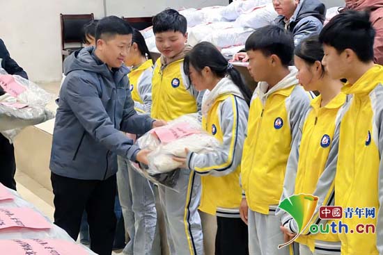 团乐业县委书记李新旺为同乐中学的学生发放物资。北京科技大学研支团供图