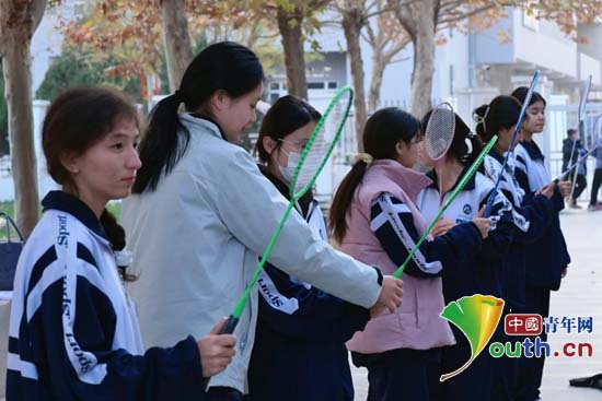 研支团成员李丹飞指导学生打羽毛球。华中师范大学研支团供图