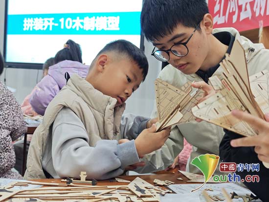 研支团成员指导孩子拼装“歼-10”战斗机模型。西北工业大学研支团供图