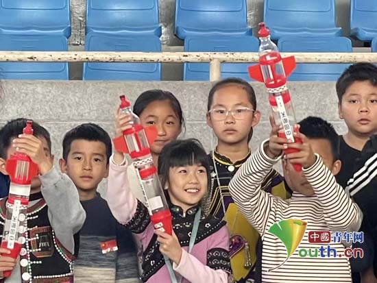 孩子们展示自己制作的“水火箭”。西北工业大学研支团供图