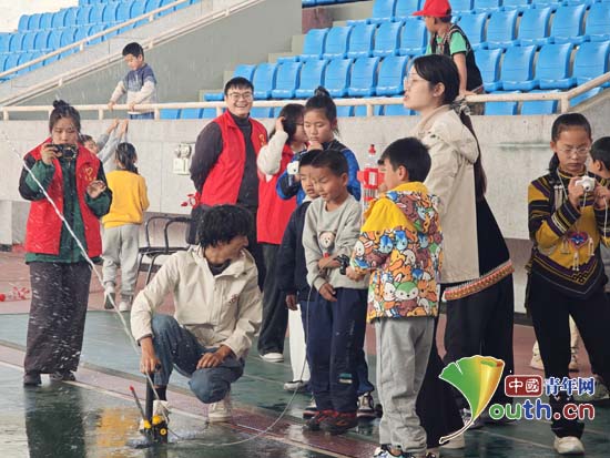 研支团成员与孩子们一起放飞“水火箭”。西北工业大学研支团供图