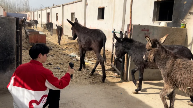 马子航在毛驴养殖基地拍摄助农宣传片。喀什地区融媒体中心 记者李霖 摄