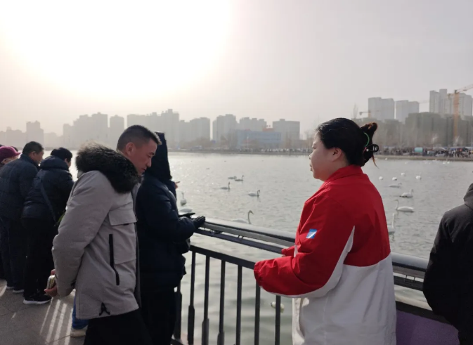 除了庙会服务,守护梨城生态名片也是张岩重要的工作内容。春节期间,杜鹃河成为市民游客赏景打卡的热门地,人流量增加给天鹅保护工作带来了压力。张岩主动加入天鹅保护志愿服务队,在杜鹃河天鹅驿站向游客科普天鹅的生活习性与迁徙知识,宣传水环境治理成果,引导市民游客文明赏景、爱护生态。看着越来越多的游客主动践行文明理念,天鹅在河中悠然栖息,张岩深刻体会到,志愿服务既是付出,更是温暖与责任的传递。