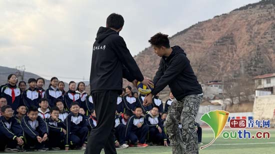 福建师范大学第27届研究生支教团联合该校体育科学学院筑魂实践队在甘肃省定西市第一中学开展“青苗计划”多元体育主题课堂活动。图为福建师大志愿者为学生开设排球训练课。福建师大研支团供图